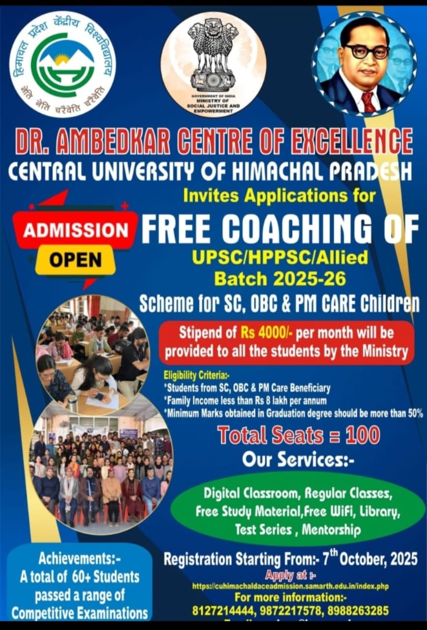 Online applications are invited by the Dr. Ambedkar Centre of Excellence, Central University of Himachal Pradesh, Dharamshala under the scheme of Ministry of Social Justice and Empowerment, Government of India. - Free Coaching for UPSC/HPPSC/ALLIED funded by MoSJE at CUHP, Dharamshala